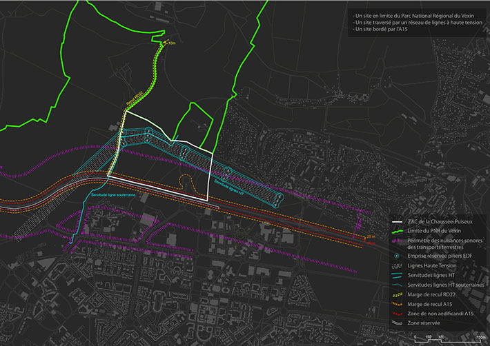 Elaboration du schéma directeur, étude de réceptivité des parcelles, établissement du cahier des prescriptions Architecturales, Urbanistiques, Paysagères et Environnementales, élaboration des fiches de lots et assistance à Maîtrise d’Ouvrage pour le suivi et la réalisation des projets présentés par les preneurs de lot. Le projet comprenait la reprise de désordres sur des aménagements hydrauliques en proposant un aménagement paysager redonnant au ru du sites son rythme naturel. L'aménagement prend avantage des contraintes topographiques importantes en développant un talutage gérant les limites de parcelles et les vues sur le paysage lointain. Un assainissement naturel gravitaire utilisant des noues permet d’accueillir les eaux de pluies du plateau et d'agrémenter le "parc d'excellence". Un système de parcelles divisibles apporte une flexibilité au schéma directeur lui permettant de s'adapter au mieux aux besoins des preneurs de lots.