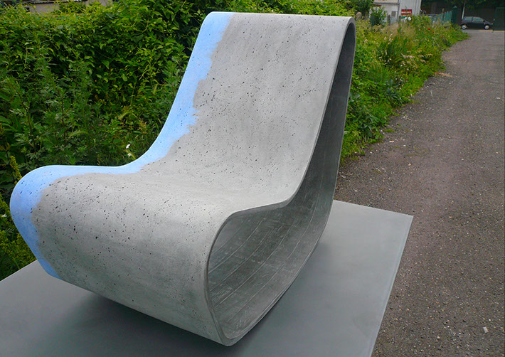 Le fauteuil Looping chair s'inspire du dessin de Willy Guhl revisité avec la technologie du Ductal® permettant d'obtenir un ruban de béton d'une épaisseur de 1,5 cm. Sa constitution lui permet d'allier résistance et souplesse en proposant un aspect béton résolument contemporain. Ainsi, ce mobilier peut aussi bien être utilisé en intérieur qu'en extérieur se mariant avec toutes les ambiances. La béton a été fixée avec une cire pour exempter la finition de la poudre de laitance.