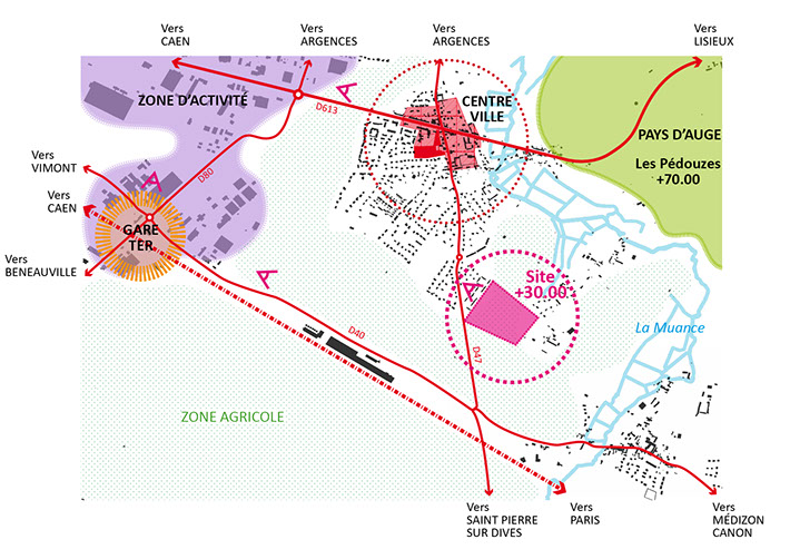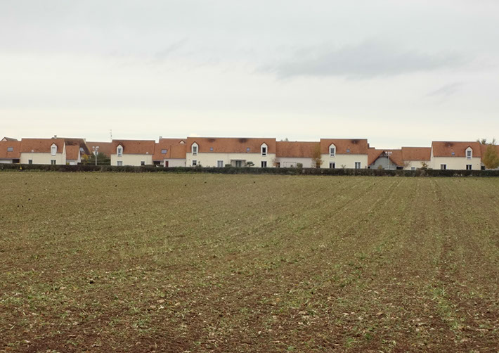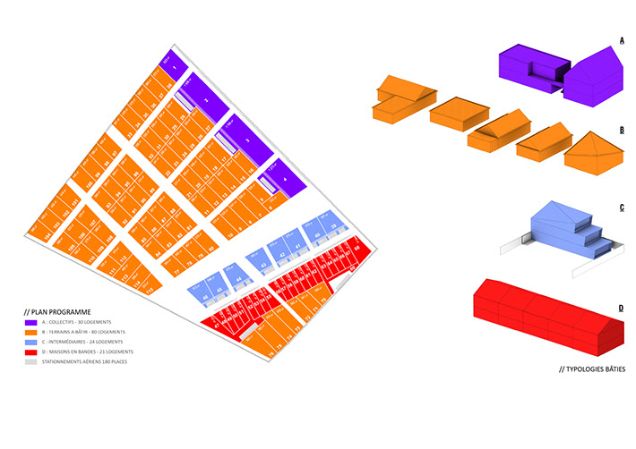 Situé à proximité directe du cœur de Moult, le projet de quartier du Val des Cigognes représente une opportunité foncière importante au regard du développement de la commune et du grand Caen en général. Il est proposé d’y implanter une offre de logements diversifiés s’inspirant des caractéristiques résidentiels existantes. Le tracé viaire projeté s’aligne pour partie aux axes existants. En effet, les quatre nouvelles rues crées sont quasi-parallèles car elles se déploient en léger éventail. Ce choix favorise la continuité urbaine et privilégie le panorama sur le paysage environnant notamment sur l’Eglise d’Airan. La situation de promontoire du site accentue cette perspective et les jardins privatifs profitent pleinement du sud. 150 à 160 logements sont crées variant du petit collectif, au logement intermédiaire, individuel accolé, ou encore au lot libre pour l’habitat individuel. La topographie du site permet également d’inscrire le projet dans une démarche durable, grâce à l’aménagement de noues plantées pour la gestion des eaux pluviales.