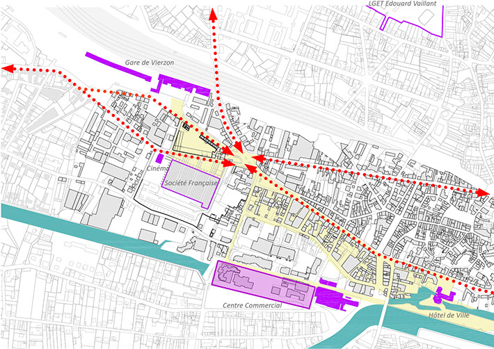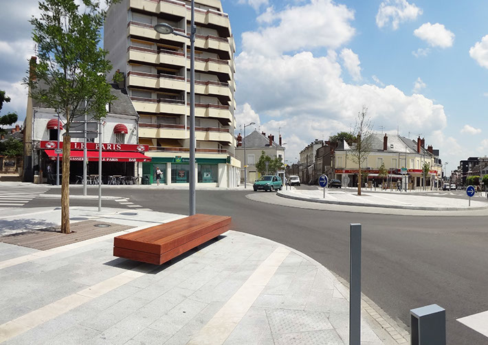 La Place Gabriel Péri constitue l’entrée ouest du centre-ville de Vierzon. A proximité directe de la gare, elle est fortement fréquentée et traversée chaque jour par 20 000 véhicules. Sa requalification est l’occasion de remplacer le carrefour à 6 branches par un giratoire, permettant ainsi de mieux gérer la circulation automobile et de diminuer l’emprise accordée à la voiture. L’espace mis en place est désormais au profit d’espaces cycles et piétons plus généreux et également plus sécurisés. La forte déclivité du site a permis de mettre en place de larges emmarchements face à l’emblématique bâtiment industriel ‘B3’ et de prolonger de cette façon l’actuel parvis. Le giratoire propose un agrément minimaliste et épuré, et en partie franchissable pour les convois exceptionnels. L’aménagement global est à tendance minérale aux nuances claires. Le mobilier d’assise mis en place propose des banquettes en bois aux lignes épurées, résolument contemporaines, permettant aux promeneurs de profiter d’espaces d’échanges, de rencontres, et de repos.