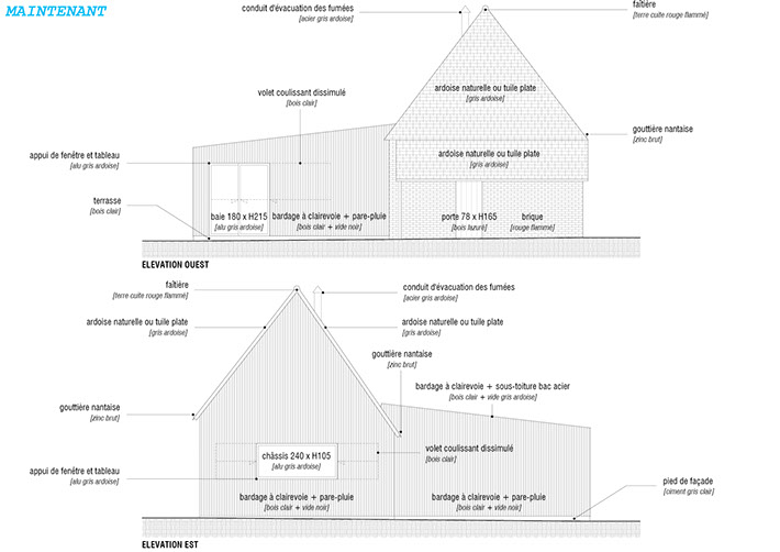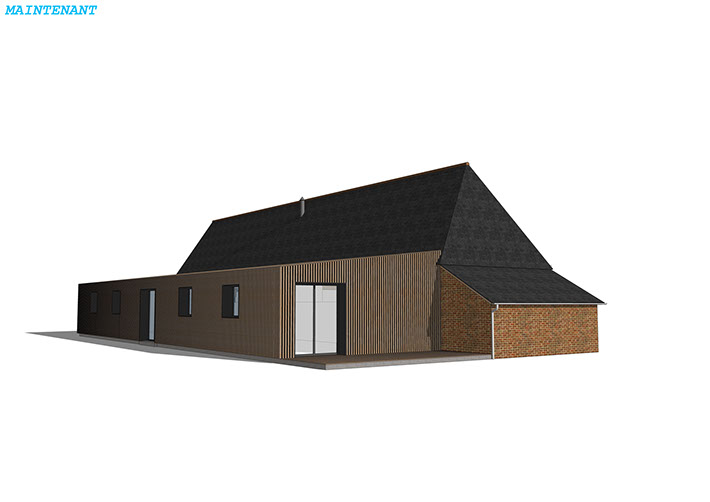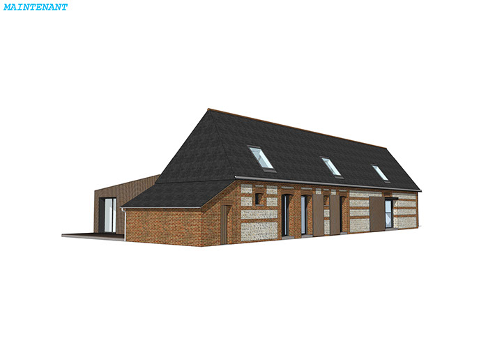 Datant du début du siècle dernier, cette grange sera bientôt transformée en logement en vue d’accueillir une jeune famille composée de deux adultes et de deux jeunes enfants ; un programme s’étendant sur une surface utile globale d’environ 300 m² avec les dernières exigences thermiques et les envies actuelles d’ambiances de vie. Ce projet qui traite clairement de patrimoine, offre un exercice sur le devenir des constructions anciennes et leur réhabilitation en lieux de vie confortables et contemporains. Afin d’allier au mieux langage traditionnel et modernité, nous proposons de maintenir le maximum d’éléments originels et de sublimer, de manière très simple, le caractère authentique du lieu. La grange dispose encore de sa charpente ‘cathédrale’ en excellent état qui sera poncée et laissée au naturel, les murs de silex et de briques autant intérieurs qu’extérieurs seront conservés et mis en scène dans le projet. Avec une surface hors normes, le projet est un défi d’astuces pour proposer des solutions techniques et esthétiques réduisant sensiblement le prix au m².