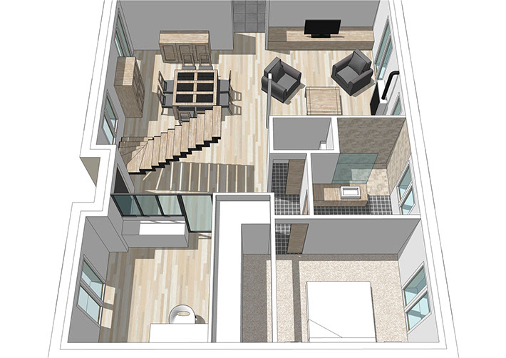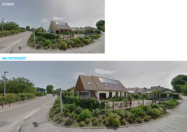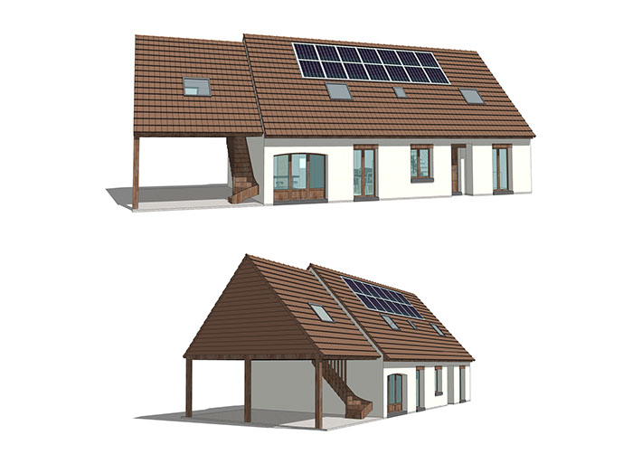 Cette opération située à Bolleville en Seine-Maritime concerne la rénovation tant esthétique que thermique d’un pavillon datant d’une quinzaine d’année. Le projet consiste à repenser entièrement l’agencement intérieur pour s’affranchir au maximum des cloisons et d’ouvrir l’espace aux lieux de vie les plus usités. Une extension est également prévue sous forme de charreterie dans le prolongement du pignon Nord, reprenant le langage général du quartier, mais rompant avec la monotonie formelle de l’habitation existante. Avec des descentes de réseaux et des descentes de charges sur des poteaux, les contraintes à prendre en compte sont nombreuses, mais le projet a su tirer parti des différents éléments pour fournir un environnement aux inspirations industrielles, originales et résolument contemporaines. Pour autant, la performance thermique n’a pas été négligée. Véritable talon d’Achille de cette construction bon marché, elle a été entièrement revue en termes d’isolation, d’infiltrométrie et renouvellement d’air.