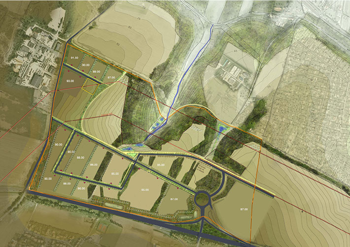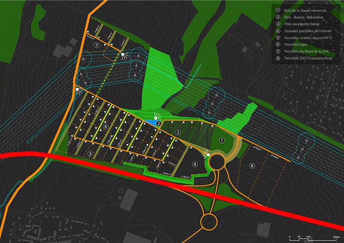 Elaboration du schéma directeur, étude de réceptivité des parcelles, établissement du cahier des prescriptions Architecturales, Urbanistiques, Paysagères et Environnementales, élaboration des fiches de lots et assistance à Maîtrise d’Ouvrage pour le suivi et la réalisation des projets présentés par les preneurs de lot. Le projet comprenait la reprise de désordres sur des aménagements hydrauliques en proposant un aménagement paysager redonnant au ru du sites son rythme naturel. L'aménagement prend avantage des contraintes topographiques importantes en développant un talutage gérant les limites de parcelles et les vues sur le paysage lointain. Un assainissement naturel gravitaire utilisant des noues permet d’accueillir les eaux de pluies du plateau et d'agrémenter le "parc d'excellence". Un système de parcelles divisibles apporte une flexibilité au schéma directeur lui permettant de s'adapter au mieux aux besoins des preneurs de lots.