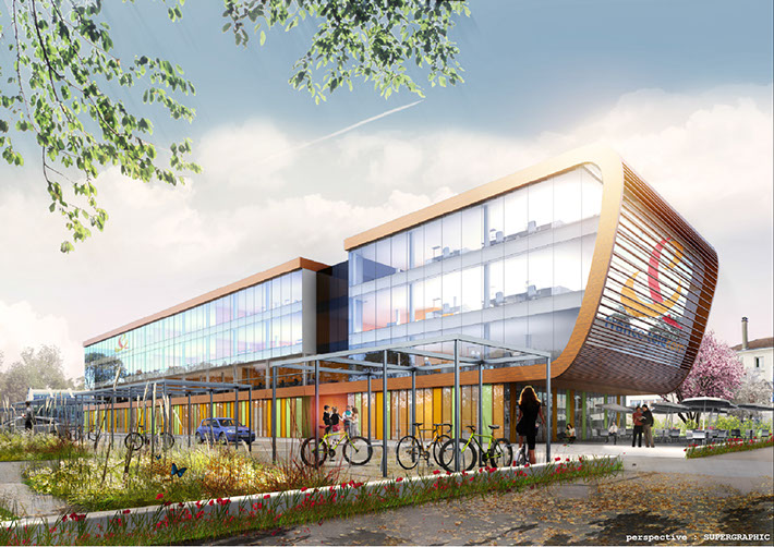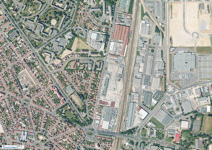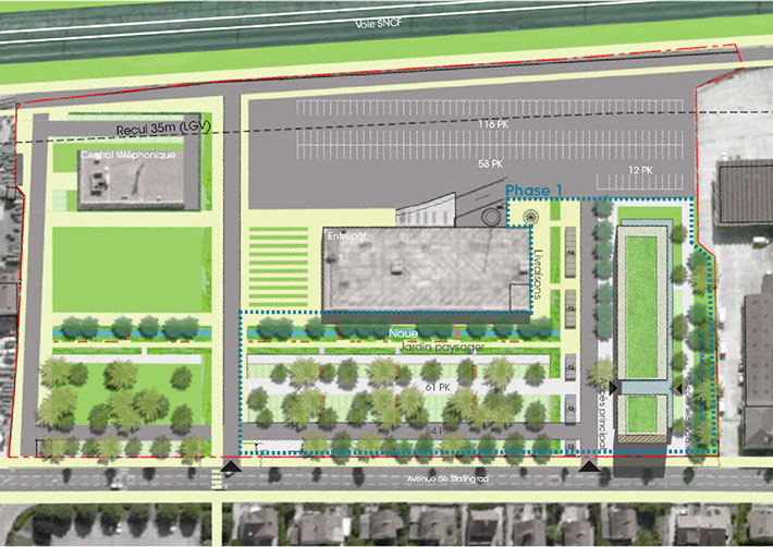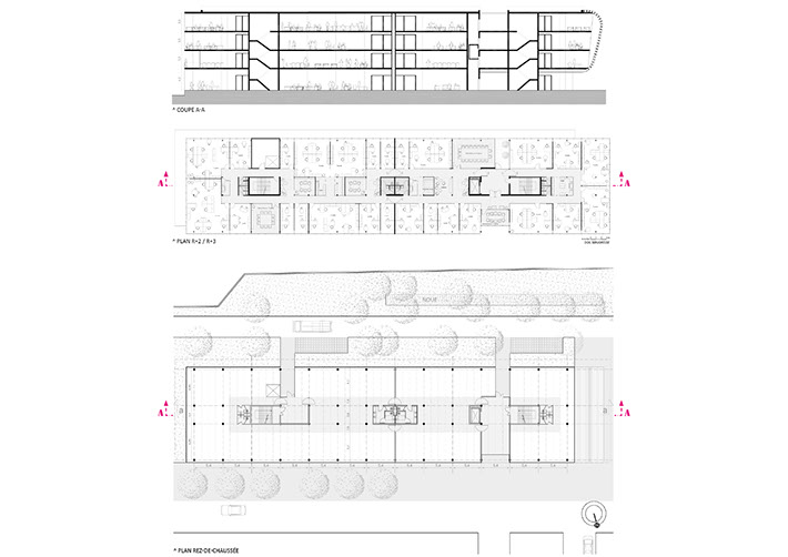 Située entre l’avenue de Stalingrad et l’actuel rail, future LGV Rhin-Rhône, cette parcelle de 34 000m² accueille plusieurs édifices à vocation de bureaux et d’activités industrielles. Les différents éléments de ce parc immobilier sont vieillissants et une restructuration de l’ensemble est nécessaire. Le projet propose de redynamiser l’ensemble en apportant dans un premier lieu un attrait paysager au site. Une noue plantée est mise en place et la nouvelle plateforme de stationnement proposée est engazonnée. L’actuel hangar est maintenu en partie, et un remembrement de l’ensemble est proposé à plus long terme. Le bâtiment de bureaux est démoli. Construit pour une période déterminée, il ne répond plus aux normes actuelles et ne présentent pas de qualité architecturales manifestes. Un nouveau bâtiment est proposé. Compacte, il est énergétiquement performant, et pallie aux contraintes acoustiques et thermiques grâce à sa double peau. Le bâtiment se déploie sur un linéaire de 80 mètres de quatre niveaux.