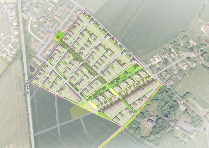 Situé à proximité directe du cœur de Moult, le projet de quartier du Val des Cigognes représente une opportunité foncière importante au regard du développement de la commune et du grand Caen en général. Il est proposé d’y implanter une offre de logements diversifiés s’inspirant des caractéristiques résidentiels existantes. Le tracé viaire projeté s’aligne pour partie aux axes existants. En effet, les quatre nouvelles rues crées sont quasi-parallèles car elles se déploient en léger éventail. Ce choix favorise la continuité urbaine et privilégie le panorama sur le paysage environnant notamment sur l’Eglise d’Airan. La situation de promontoire du site accentue cette perspective et les jardins privatifs profitent pleinement du sud. 150 à 160 logements sont crées variant du petit collectif, au logement intermédiaire, individuel accolé, ou encore au lot libre pour l’habitat individuel. La topographie du site permet également d’inscrire le projet dans une démarche durable, grâce à l’aménagement de noues plantées pour la gestion des eaux pluviales.