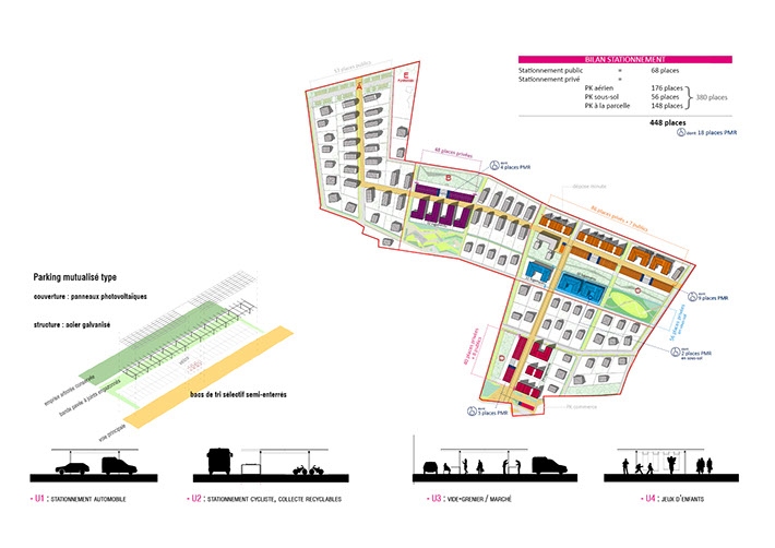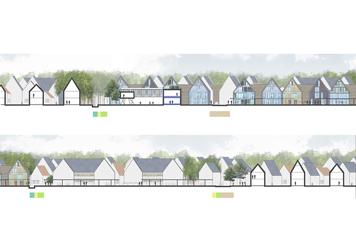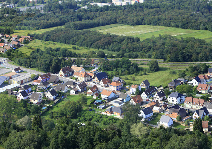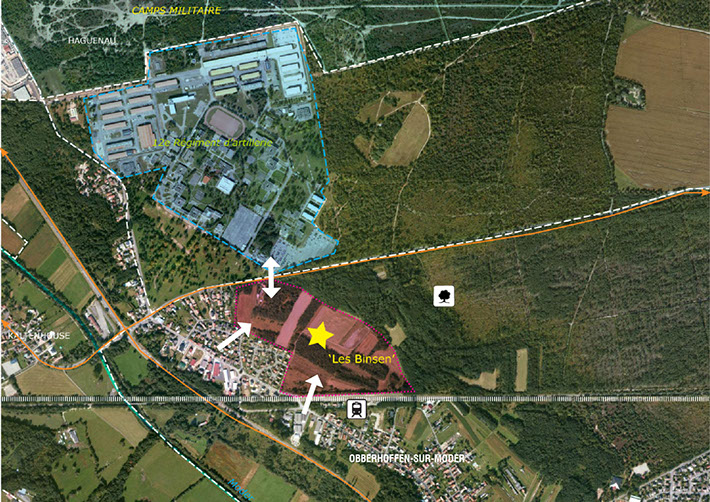 Le nouveau quartier ‘Les Binsen’ s’inscrit dans la continuité de la commune, il s’étend sur 8.1 ha, créant une offre de 500 logements [200 en phase 1/300 en phase 2], de nouveaux équipements et services de proximité dont une crèche, une superette. Le projet s’appuie sur les atouts paysagers du site, le maillage urbain repose sur l’interpénétration des espaces boisés existants maintenus en partie et les nouvelles constructions. Le quartier est porté par l’axe est-ouest, connecté au centre-ville. Cette ‘spielstrasse’ dessert les différents logements et équipements, ainsi que deux jardins publics, l’amphithéâtre de verdure en périphérie. Le projet s’inscrit dans une démarche durable ; les abris vélos jalonnant la spielstrasse sont pourvus de panneaux solaires, l’eau de pluie est gérée par des noues, les modes doux sont privilégiés et les futures constructions offrent un cadre de vie sain, respectueux de l’environnement. Les caractéristiques architecturales des nouvelles constructions s’appuient sur les formes traditionnelles locales.