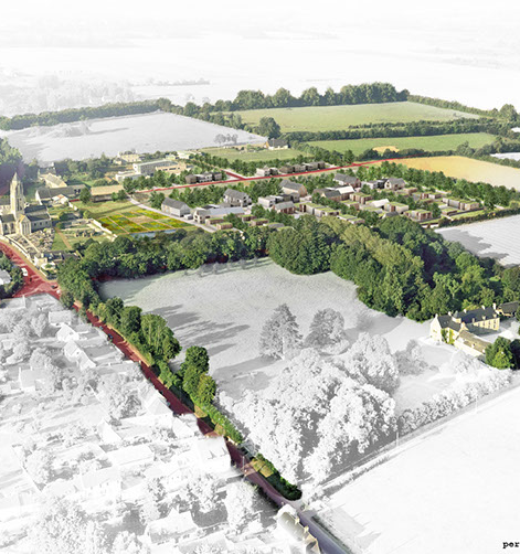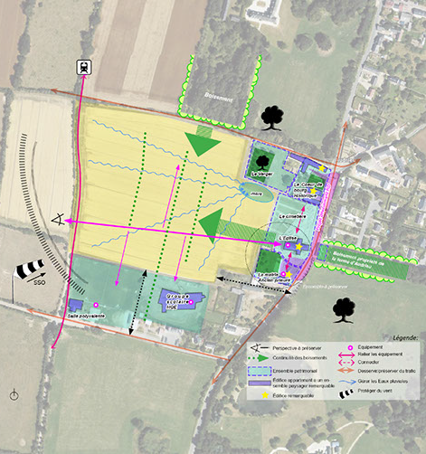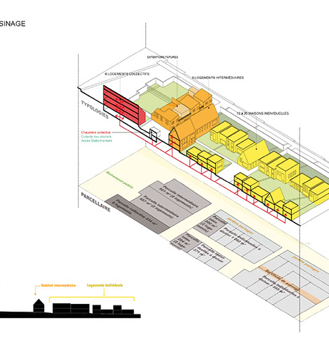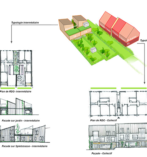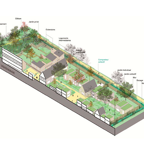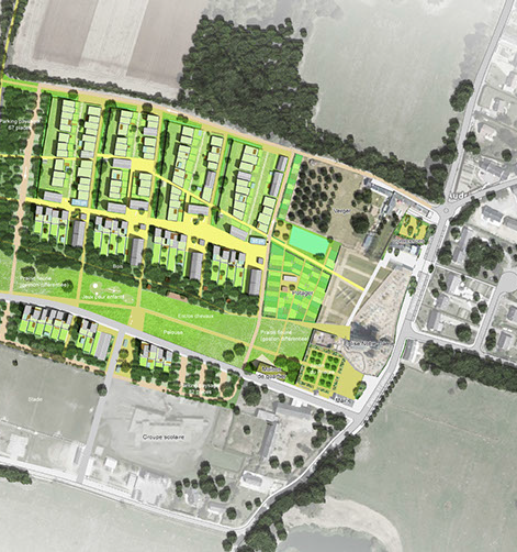 Le projet d’Ecoquartier ‘Cœur de Bourg’ concrétise le souhait d’extension raisonnée de la commune d’Audrieu. Le plan d’aménagement proposé s’appuie sur les spécificités paysagères du site en prônant une démarche résolument contemporaine et durable. L’urbanisation s’effectue par unités de voisinages [20 à 40 logements par unité] en optant pour un quartier minimisant les circulations véhiculaires tout en respectant les besoins des habitants. Chaque unité accueille un stationnement mutualisé, une chaudière collective, un point de collecte, un jardin partagé et un composteur. L’artère principale du projet, la ‘spielstrasse’, offre une belle perspective sur l’Eglise Notre Dame et permet à tous les riverains de profiter d’un espace de rassemblement, d’échange et de rencontres propice au marchés et autres manifestations. Ici ‘l’humain’ est placé au coeur du projet. Les surfaces construites sont compactes afin de préserver au mieux les attraits paysagers du site et les espaces en pleine terre. Le projet offre 145 logements répartis en 3 typologies.