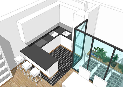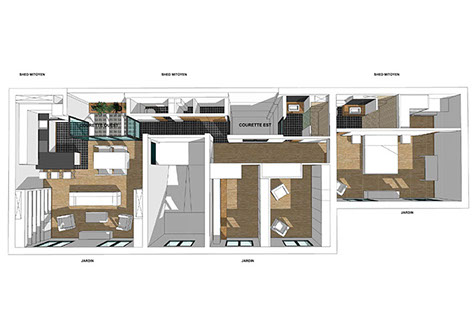 Situé dans le XIe arrondissement de Paris, le projet concerne la réunion et le réaménagement de deux appartements connexes d'une surface d'environ 30 et 50 m². La liaison est réalisée par les deux salles de bain existantes. L'organisation des appartements a totalement été repensée en réarticulant les lieux à partager et redistribuant l'espace. Par la même, les différents réseaux ont été repris pour adapter un nouveau circuit d'électricité et de chauffage plus économe. Une longue perspective a été pensée à travers les courettes "puits de lumière" agrémentant la circulation de cette composition singulière. La conception comprenait la création de plusieurs mobiliers de rangements sur mesure : bibliothèque, bureau, dressing... Des références de mobilier seront proposées pour la future décoration intérieure. Un travail de mise en lumière a été imaginé afin de créer des ambiances lumineuses adaptées aux divers espaces et usages. Le projet vient créer un lien avec une des courettes lui offrant une accessibilité et un développement paysager.