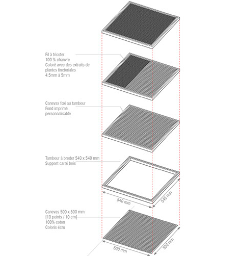 TapX part d’un souvenir de banc d’école, un cadeau pour la fête des mères un peu oublié, et pourtant qui a toujours été là, accroché dans le salon. Nous avons souhaité le mettre au goût du jour, faisant de la création d’un tapis, un jeu ouvert à tous les âges et à toutes les tendances. Ce souvenir, c’est le point de croix, un point de broderie ancestral, facilement réalisable, et permettant une véritable liberté de texture, de graphisme et de dimensions. L’usager n’est plus le simple spectateur de ce qu’il consomme, il participe activement à l’acte de création. TapX devient ainsi une création originale, personnalisable à souhait. Il suffit en effet d’imprimer le graphisme de son choix, ou de choisir un imprimé de canevas existant et de s’adonner ainsi aux joies du point de croix, et à la réalisation de tapis personnalisés pour chez soi ou pour offrir. Afin d’en faciliter l’usage, nous avons souhaité partir sur un module carré et de proposer de multiplier les modules pour créer un patchwork unique et original.