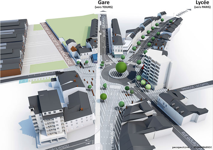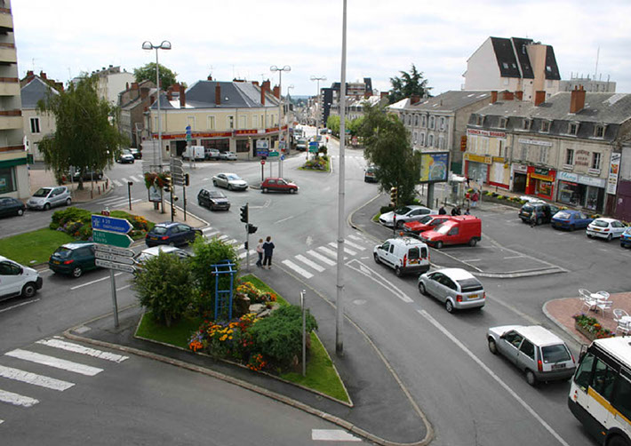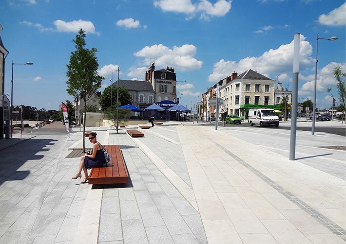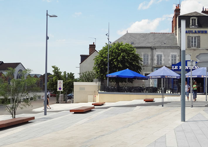 La Place Gabriel Péri constitue l’entrée ouest du centre-ville de Vierzon. A proximité directe de la gare, elle est fortement fréquentée et traversée chaque jour par 20 000 véhicules. Sa requalification est l’occasion de remplacer le carrefour à 6 branches par un giratoire, permettant ainsi de mieux gérer la circulation automobile et de diminuer l’emprise accordée à la voiture. L’espace mis en place est désormais au profit d’espaces cycles et piétons plus généreux et également plus sécurisés. La forte déclivité du site a permis de mettre en place de larges emmarchements face à l’emblématique bâtiment industriel ‘B3’ et de prolonger de cette façon l’actuel parvis. Le giratoire propose un agrément minimaliste et épuré, et en partie franchissable pour les convois exceptionnels. L’aménagement global est à tendance minérale aux nuances claires. Le mobilier d’assise mis en place propose des banquettes en bois aux lignes épurées, résolument contemporaines, permettant aux promeneurs de profiter d’espaces d’échanges, de rencontres, et de repos.